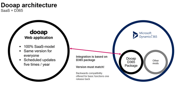 Dooap follows the update policy of Microsoft D365 and is compatible with the D365 versions that are officially supported by Microsfot, i.e. with the D365 versions that are no older than one service update.