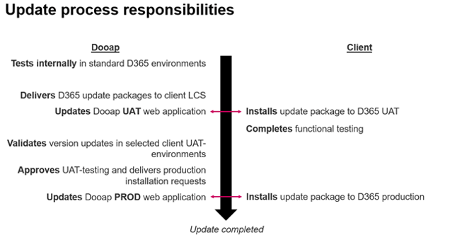 The defined Customer technical contacts will receive the new Dooap-D365/AX-package to be deployed to Customer's D365/AX environment. It is crucial to install the latest package to ensure optimal functionality of Dooap.