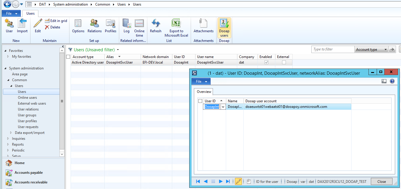 Since AX2012 is not in the cloud, a separate manual linking between AX users and their Entra accounts is needed. All users (the integration user, end users & Dooap consultants) are required to be linked to their Entra accounts via the Dooap users function.